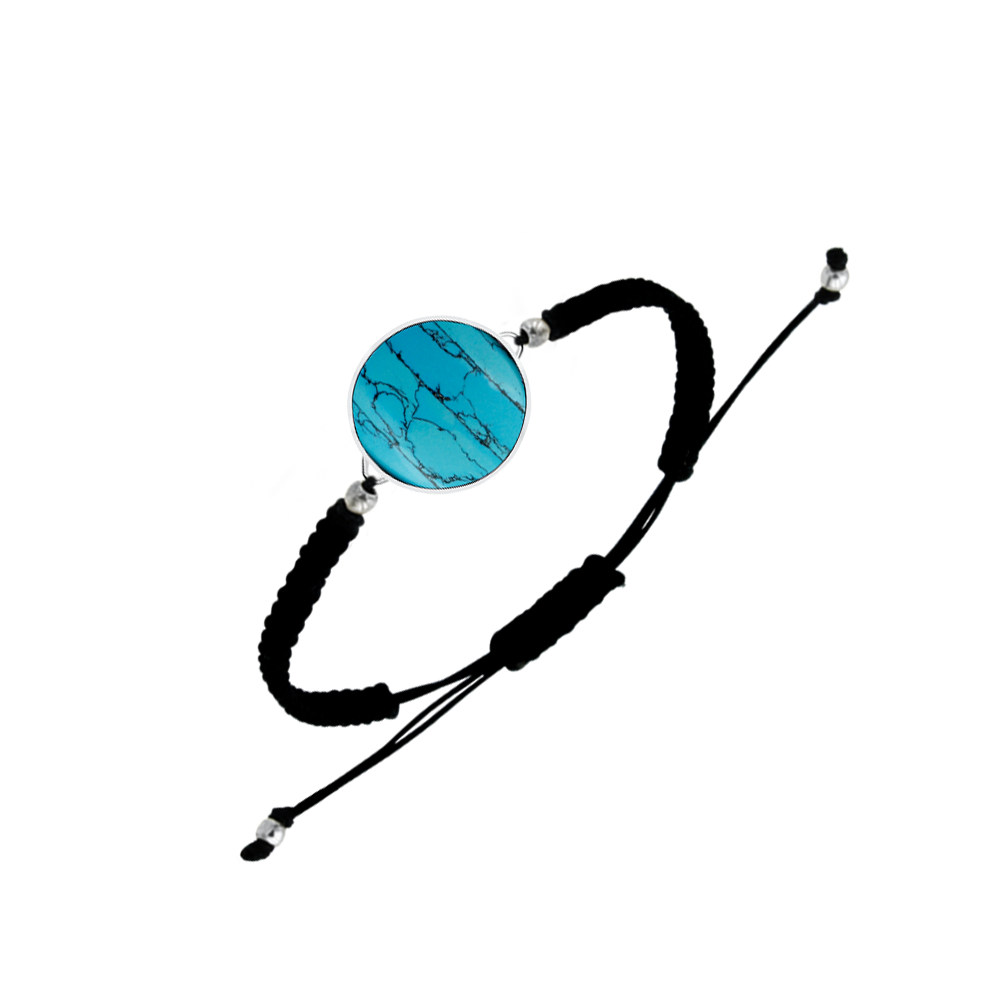 Χειροποίητο Βραχιόλι Μακραμέ με στρογγυλή ορυκτή πέτρα Τουρκουάζ από Ασήμι 925 Επιπλατινωμένο. Το μέγεθος αυξομειώνεται από το μαύρο κορδόνι. Μπορεί να φορεθεί σε οποιαδήποτε περίσταση.