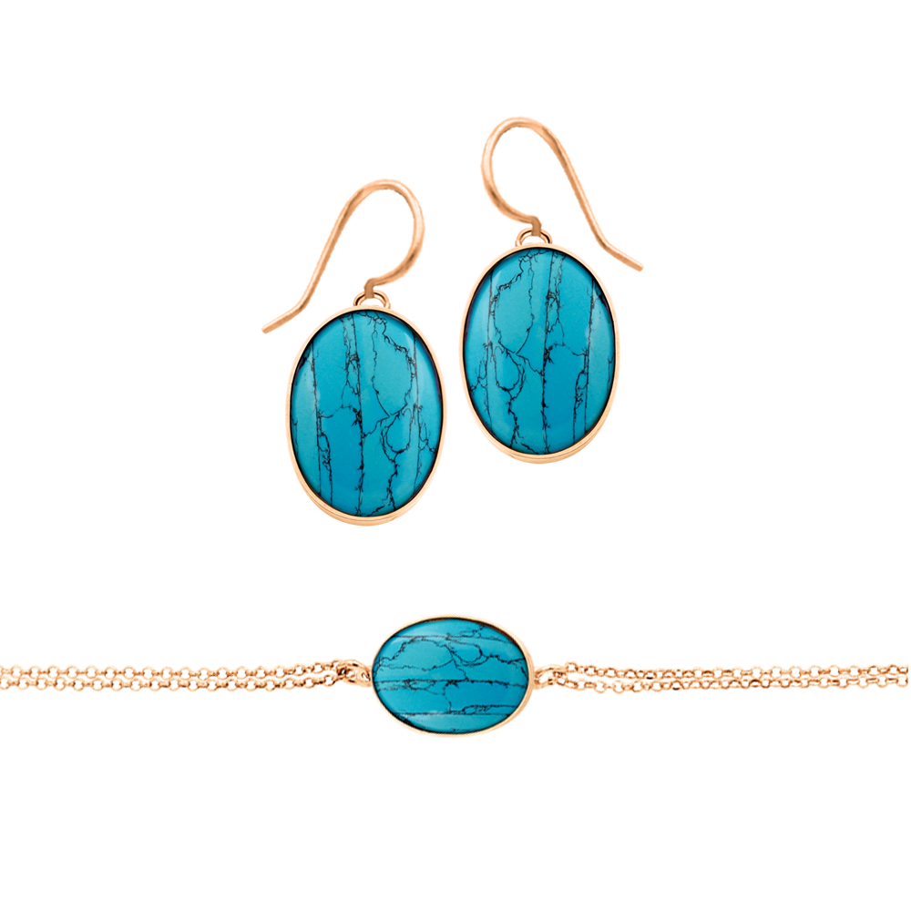 Χειροποίητό Σετ οβάλ με ορυκτές πέτρες Τουρκουάζ από Ασήμι 925 Επιχρυσωμένο με Ροζ Χρυσό Κ24. Αποτελείται από Σκουλαρίκια και Βραχιόλι. Μπορούν να φορεθούν σε οποιαδήποτε περίσταση δίνοντας ιδιαίτερη λάμψη.