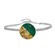 Μοναδικό χειροποίητο Βραχιόλι με σμάλτο, φύλλα χρυσού και υγρό γυαλί από μέταλλο ορείχαλκου. Χρώμα μέταλλου: Ροζ χρυσό. Φινίρισμα: Σαγρέ ματ. Χρώμα Σμάλτου: Πράσινο και φύλλα χρυσού. Το Βραχιόλι αυξομειώνεται από την αλυσίδα. Το χρώμα πράσινο Συμβολίζει την ανάπτυξη την αρμονία και την γονιμότητα. Φοριέται όλες τις Εποχές και ταιριάζει με Καθημερινό και Βραδινό ντύσιμο.