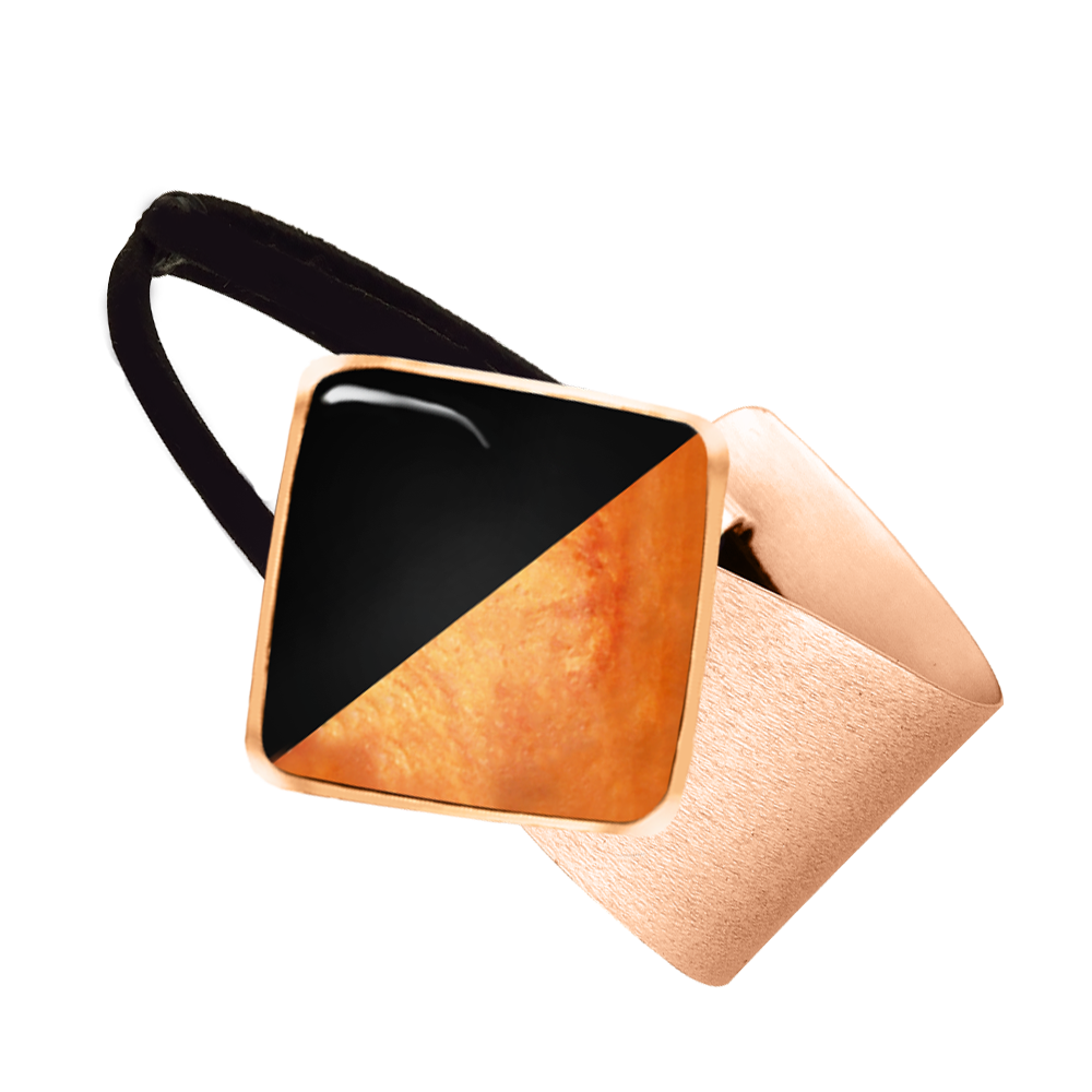 Μοναδικό χειροποίητο Βραχιόλι τετράγωνο από μέταλλο ορείχαλκου με σμάλτο και υγρό γυαλί. Φινίρισμα: Σαγρέ ματ. Χρώμα μέταλλου: Ροζ χρυσό. Χρώμα Σμάλτου: Ροδακινί και μαύρο. το μέγεθος αυξομειώνεται από το μαύρο κορδόνι. Το μαύρο χρώμα Συμβολίζει την επιμονή, σταθερότητα και σοβαρότητα. Φοριέται όλες τις Εποχές και ταιριάζει με Καθημερινό, Βραδινό και Επίσημο ντύσιμο.