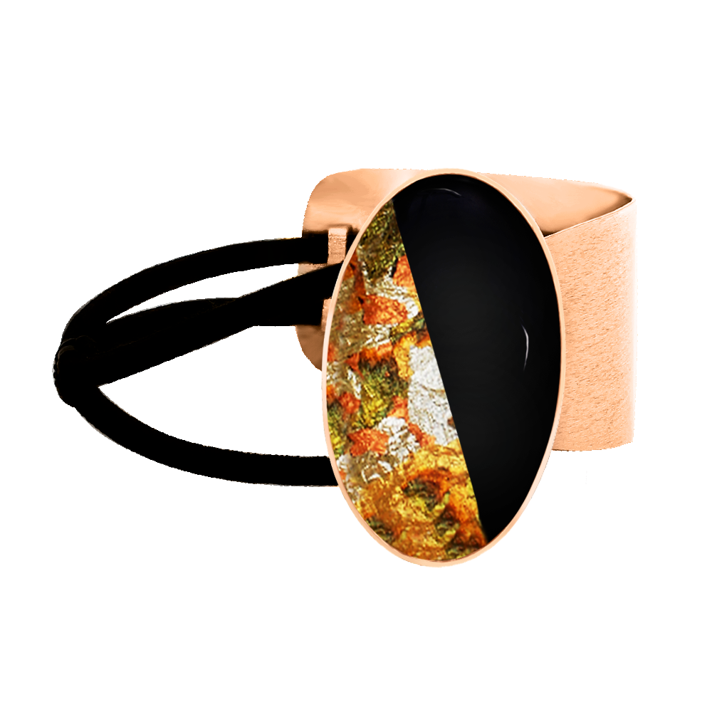 Μοναδικό χειροποίητο Βραχιόλι οβάλ από μέταλλο ορείχαλκου με σμάλτο, φύλλα χρυσού και υγρό γυαλί. Φινίρισμα: Σαγρέ ματ. Χρώμα μέταλλου: Ροζ χρυσό. Χρώμα Σμάλτου: Μαύρο και φύλλα χρυσού. το μέγεθος αυξομειώνεται από το μαύρο κορδόνι. Το μαύρο χρώμα Συμβολίζει την επιμονή, σταθερότητα και σοβαρότητα. Φοριέται όλες τις Εποχές και ταιριάζει με Καθημερινό, Βραδινό και Επίσημο ντύσιμο.