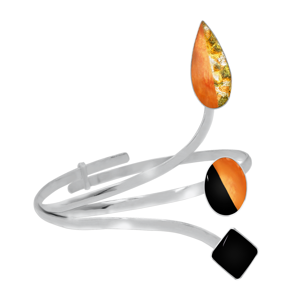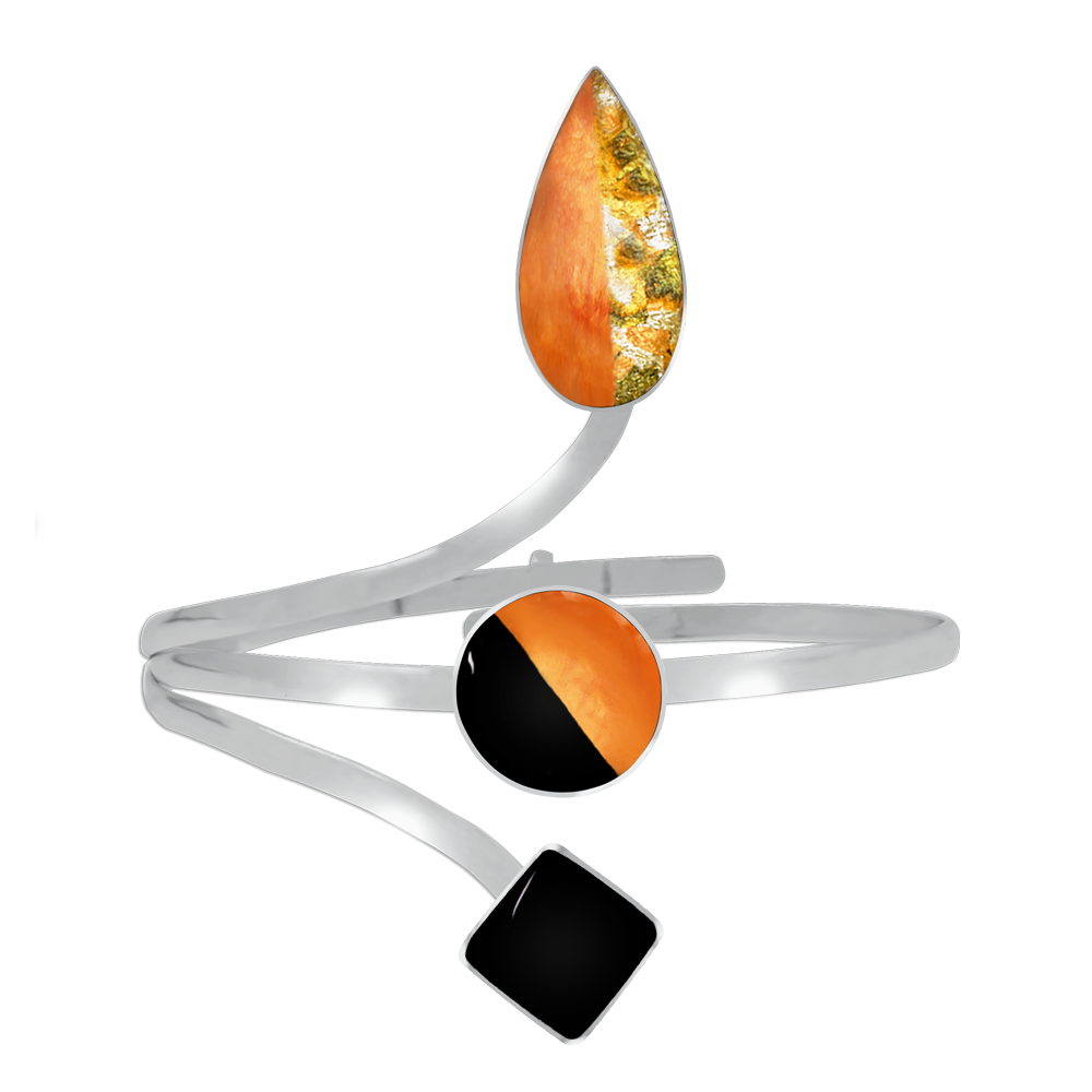 Υπέροχο χειροποίητο Βραχιόλι για Βραχίονα με σμάλτο, φύλλα χρυσού και υγρό γυαλί από μέταλλο ορείχαλκου. Χρώμα Μέταλλου: Επαργυρωμένο. Φινίρισμα: Γυαλιστερό. Χρώμα Σμάλτου: Ροδακινί, μαύρο και φύλλα χρυσού. Είναι το κομμάτι του ΣΕΤ Πολυτέλεια. Ένα σχέδιο εμπνευσμένο από την επιτυχία, χαρά και ενθουσιασμού. Μας παραπέμπει στον πλούτο την εξουσία και την δύναμη. Φοριέται όλες τις Εποχές και ταιριάζει με Βραδινό και Επίσημο ντύσιμο.