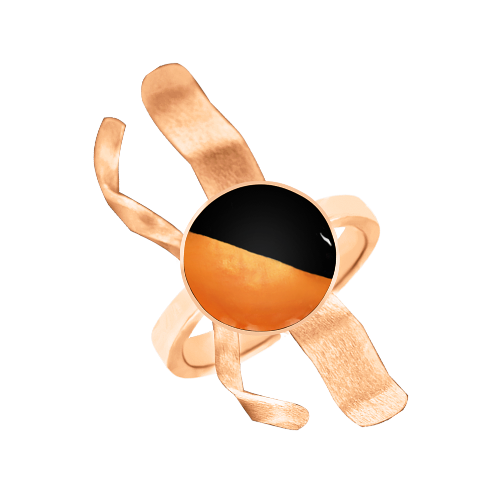 Μοναδικό χειροποίητο Δαχτυλίδι με σμάλτο και υγρό γυαλί από μέταλλο ορείχαλκου. Χρώμα Σμάλτου: Μαύρο και ροδακινί. Το μέγεθος αυξομειώνεται. Είναι το κομμάτι του ΣΕΤ Αποπλάνηση. Το Μαύρο Συμβολίζει δύναμη, κομψότητα και μυστήριο. Το Χρώμα ροδακινί Συμβολίζει την ισορροπία, ενεργεία και δημιουργία. Φοριέται όλες τις Εποχές και ταιριάζει με Καθημερινό, Βραδινό και Επίσημο ντύσιμο.