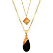 Μοναδικό χειροποίητο Κολιέ με σμάλτο, φύλλα χρυσού και υγρό γυαλί από μέταλλο ορείχαλκου με ατσάλινη διπλοί αλυσίδα. Φινίρισμα: Γυαλιστερό. Χρώμα μέταλλου: Ροζ χρυσό. Χρώμα Σμάλτου: Ροδακινί, μαύρο και φύλλα χρυσού. Το κολιέ αυξομειώνεται από την αλυσίδα. Τα φύλλα χρυσού συμβολίζουν τον Ήλιο το οποιο θεωρείται χρώμα ηλιακό με ιδιαίτερη δημιουργική και θετική ακτινοβολία στο περιβάλλον. Φοριέται όλες τις Εποχές και ταιριάζει με Καθημερινό και Βραδινό ντύσιμο.