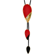 Υπέροχο χειροποίητο Κολιέ σε σχήμα σταγόνα από μέταλλο ορείχαλκου με σμάλτο, φύλλα χρυσού και υγρό γυαλί. Φινίρισμα: Γυαλιστερό. Χρώμα μέταλλου: Επαργυρωμένο. Χρώμα Σμάλτου: Κόκκινο και φύλλα χρυσού. Το Κολιέ αυξομειώνεται από τo μαύρο κορδόνι. Το κόκκινο είναι το χρώμα της φωτιάς της δύναμης της θερμότητας του αίματος. Φοριέται όλες τις Εποχές και ταιριάζει με Καθημερινό, Βραδινό και Επίσημο ντύσιμο.