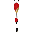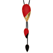 Υπέροχο χειροποίητο Κολιέ σε σχήμα σταγόνα από μέταλλο ορείχαλκου με σμάλτο, φύλλα χρυσού και υγρό γυαλί. Φινίρισμα: Γυαλιστερό. Χρώμα μέταλλου: Επιχρυσωμένο. Χρώμα Σμάλτου: Κόκκινο και φύλλα χρυσού. Το Κολιέ αυξομειώνεται από τo μαύρο κορδόνι. Το κόκκινο είναι το χρώμα της φωτιάς, της δύναμης, της θερμότητας, του αίματος. Φοριέται όλες τις Εποχές και ταιριάζει με Καθημερινό, Βραδινό και Επίσημο ντύσιμο.
