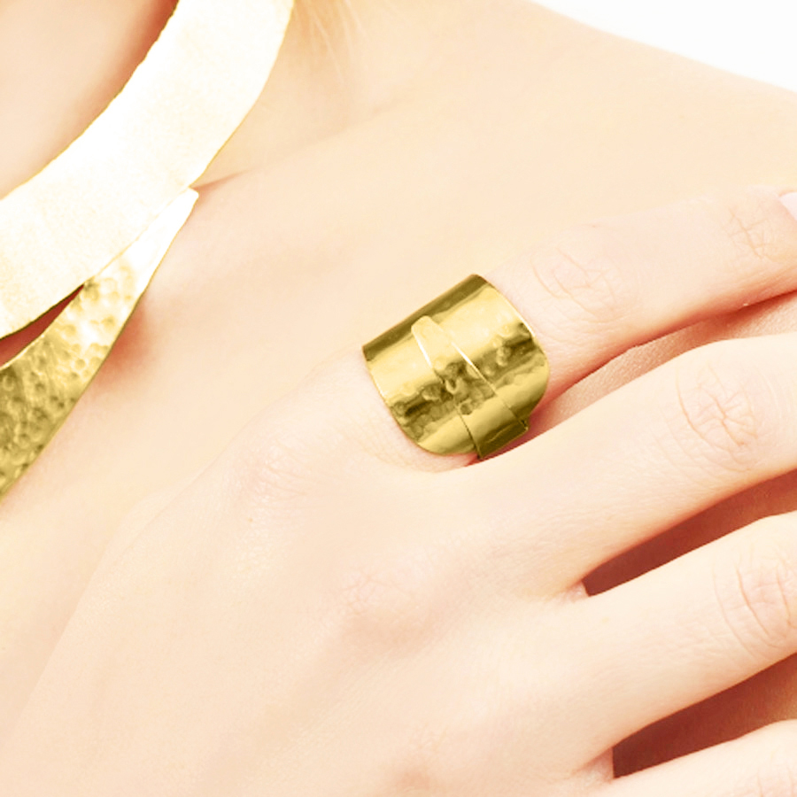 Μοναδικό χειροποίητο Δαχτυλίδι από μέταλλο ορείχαλκου, επιχρυσωμένο, σφυρήλατο. Έχει μεγάλο μέγεθος και αυξομειώνεται. Νούμερο: 51 έως 65. Είναι το κομμάτι του Σετ Μεσσαλίνα. Είναι ένα σχέδιο εμπνευσμένο από τη Μεσσαλίνα, σύζυγο του Ρωμαίου αυτοκράτορα Κλαύδιου, μία από τις σημαντικότερες προσωπικότητες της εποχής. Φοριέται όλες τις Εποχές και ταιριάζει με Επίσημο ντύσιμο.