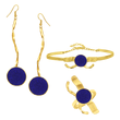 Υπέροχο χειροποίητο Σετ από μέταλλο ορείχαλκου με κρυσταλλάκια και υγρό γυαλί. Φινίρισμα: Σαγρέ ματ. Χρώμα μέταλλου: Ροζ χρυσό. Χρώμα Σμάλτου: Μπλε ηλεκτρίκ. Αποτελείται από σκουλαρίκια, βραχιόλι και δαχτυλίδι. Είναι ένα σχέδιο εμπνευσμένο από την αλήθεια την ηρεμία και εμπιστοσύνη. Συμβολίζει την εμπιστοσύνη, την πίστη, την αυτοπεποίθηση, την αλήθεια, την εξυπνάδα και την ηρεμία. Φοριέται όλες τις Εποχές και ταιριάζει με Καθημερινό, Βραδινό Επίσημο ντύσιμο.