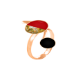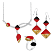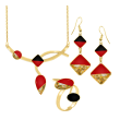 Μοναδικό χειροποίητο Σετ με σμάλτο, φύλλα χρυσού και υγρό γυαλί από μέταλλο ορείχαλκου. Χρώμα μέταλλου: Ροζ χρυσό. Φινίρισμα: Γυαλιστερό. Χρώμα Σμάλτου: Κόκκινο, μαύρο και φύλλα χρυσού. Αποτελείται από κολιέ, σκουλαρίκια και δαχτυλίδι. Το κόκκινο είναι το κατ’ εξοχήν χρώμα του ερωτικού πάθους, χρώμα της φωτιάς της δύναμης της θερμότητας του αίματος. Φοριέται όλες τις Εποχές και ταιριάζει με Καθημερινό, Βραδινό και Επίσημο ντύσιμο.