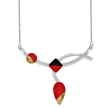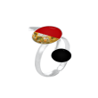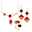 Μοναδικό χειροποίητο Σετ με σμάλτο, φύλλα χρυσού και υγρό γυαλί από μέταλλο ορείχαλκου. Χρώμα μέταλλου: Επαργυρωμένο. Φινίρισμα: Γυαλιστερό. Χρώμα Σμάλτου: Κόκκινο, μαύρο και φύλλα χρυσού. Αποτελείται από κολιέ, σκουλαρίκια και δαχτυλίδι. Το κόκκινο είναι το κατ’ εξοχήν χρώμα του ερωτικού πάθους, χρώμα της φωτιάς της δύναμης της θερμότητας του αίματος. Φοριέται όλες τις Εποχές και ταιριάζει με Καθημερινό, Βραδινό και Επίσημο ντύσιμο.