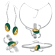 Μοναδικό Χειροποίητο Σετ με σμάλτο, φύλλα χρυσού και υγρό γυαλί από μέταλλο ορείχαλκου. Χρώμα μέταλλου: Επιχρυσωμένο. Φινίρισμα: Σαγρέ ματ. Χρώμα Σμάλτου: Πράσινο και φύλλα χρυσού. Αποτελείται από κολιέ, σκουλαρίκια, βραχιόλι και δαχτυλίδι. Το Πράσινο Συμβολίζει Ελπίδα, ευημερία, εξέλιξη, υγεία και αρμονία. Λογίζεται σαν το χρώμα της αρμονίας, της κοινωνικής προσφοράς και του αλτρουισμού. Φοριέται όλες τις Εποχές και ταιριάζει με Βραδινό και Επίσημο ντύσιμο.