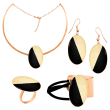 Μοναδικό Χειροποίητο Σετ με σμάλτο και υγρό γυαλί από μέταλλο ορείχαλκου. Χρώμα μέταλλου: Επιχρυσωμένο. Φινίρισμα: Σαγρέ ματ. Χρώμα Σμάλτου: Μπεζ και μαύρο. Αποτελείται από κολιέ, σκουλαρίκια, βραχιόλι και δαχτυλίδι. Ένα σχέδιο που συμβολιζει την αγνότητα τον σεβασμό, ηρεμία, αθωότητα και τρυφερότητα. Τα φύλλα χρυσού συμβολίζουν τη δύναμη τον πλούτο και τη ζεστασιά. Φοριέται όλες τις Εποχές και ταιριάζει με Βραδινό και Επίσημο ντύσιμο.