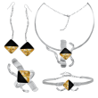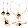 Μοναδικό Χειροποίητο Σετ με σμάλτο, φύλλα χρυσού και υγρό γυαλί από μέταλλο ορείχαλκου. Χρώμα μέταλλου: Επιχρυσωμένο. Φινίρισμα: Σαγρέ ματ. Χρώμα Σμάλτου: Μαύρο και φύλλα χρυσού. Αποτελείται από κολιέ, σκουλαρίκια, βραχιόλι και δαχτυλίδι. Είναι ένα σχέδιο εμπνευσμένο από την Αποφασιστικότητα, την Σταθερότητα, και Επιθυμία. Στοιχεία που κάνουν κάθε γυναίκα ξεχωριστή και αναδεικνύουν την προσωπικότητα της. Φοριέται όλες τις Εποχές και ταιριάζει με Βραδινό και Επίσημο ντύσιμο.
