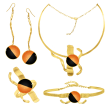 Μοναδικό Χειροποίητο Σετ με σμάλτο και υγρό γυαλί από μέταλλο ορείχαλκου. Χρώμα μέταλλου: Επαργυρωμένο. Φινίρισμα: Σαγρέ ματ. Χρώμα Σμάλτου: Μαύρο και ροδακινί. Αποτελείται από κολιέ, σκουλαρίκια, βραχιόλι και δαχτυλίδι. Το Μαύρο Συμβολίζει δύναμη, κομψότητα και μυστήριο. Το Χρώμα ροδακινί Συμβολίζει την ισορροπία, ενεργεία και δημιουργία. Φοριέται όλες τις Εποχές και ταιριάζει με Βραδινό και Επίσημο ντύσιμο.