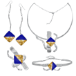 Μοναδικό Χειροποίητο Σετ με σμάλτο, φύλλα χρυσού και υγρό γυαλί από μέταλλο ορείχαλκου. Χρώμα μέταλλου: Επιχρυσωμένο. Φινίρισμα: Σαγρέ ματ. Χρώμα Σμάλτου: Μπλε και φύλλα χρυσού. Αποτελείται από κολιέ, σκουλαρίκια, βραχιόλι και δαχτυλίδι. Το Μπλε είναι το τυπικά ουράνιο χρώμα, αυτό που αναπτύσσει σε βάθος το στοιχείο της ηρεμίας. Φοριέται όλες τις Εποχές και ταιριάζει με Βραδινό και Επίσημο ντύσιμο.