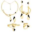 Υπέροχο Χειροποίητο Σετ με σμάλτο, φύλλα χρυσού και υγρό γυαλί από μέταλλο ορείχαλκου. Χρώμα μέταλλου: Επαργυρωμένο. Φινίρισμα: Γυαλιστερό. Χρώμα Σμάλτου: Μπεζ, μαύρο και φύλλα χρυσού. Αποτελείται από κολιέ, σκουλαρίκια, βραχιόλι και δαχτυλίδι. Ένα σχέδιο που συμβολίζει τον σεβασμό, συγκεκριμένα είναι ιδανικό για μια ταραχώδη περίοδο στη ζωή κάποιου για να του φέρει ηρεμία και σιγουριά. Φοριέται όλες τις Εποχές και ταιριάζει με Βραδινό και Επίσημο ντύσιμο.