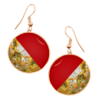 Μοναδικά χειροποίητα Σκουλαρίκια στρογγυλά από μέταλλο ορείχαλκου με σμάλτο, φύλλα χρυσού και υγρό γυαλί. Φινίρισμα: Γυαλιστερό. Χρώμα μέταλλου: Επιχρυσωμένο. Χρώμα Σμάλτου: Κόκκινο και φύλλα χρυσού. Το κόκκινο χρώμα είναι χρώμα του ερωτικού πάθους το χρώμα της φωτιάς. Φοριέται όλες τις Εποχές και ταιριάζουν με Καθημερινό και Βραδινό ντύσιμο.