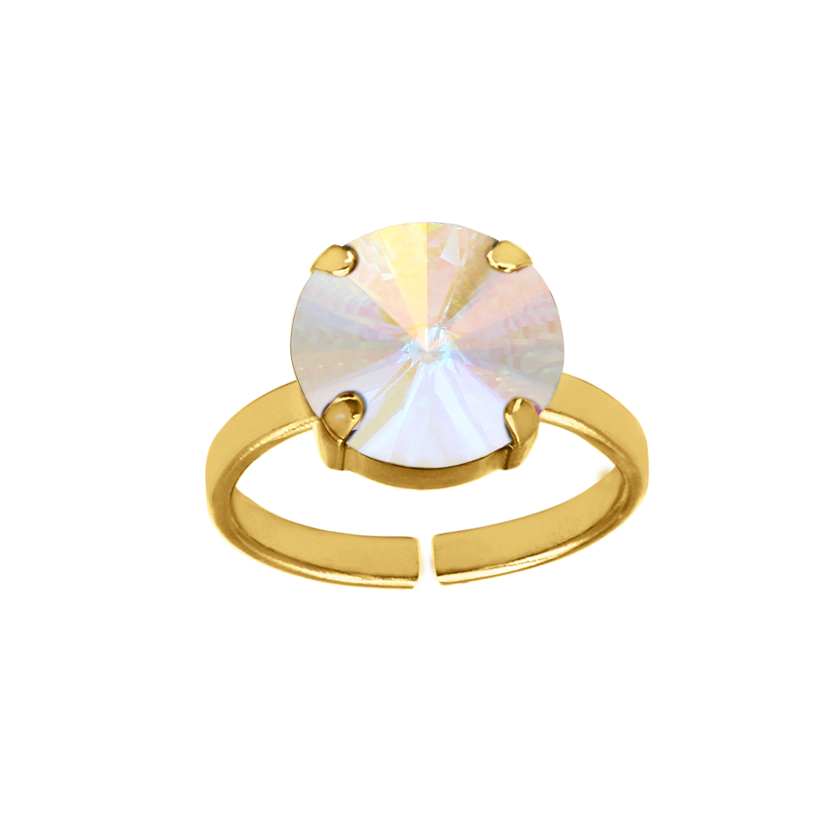 Χειροποίητο Δαχτυλίδι Μονόπετρο με ιριδίζον λευκή πέτρα Preciosa από μέταλλο ορείχαλκου, επιχρυσωμένο. Το μέγεθος αυξομειώνεται.